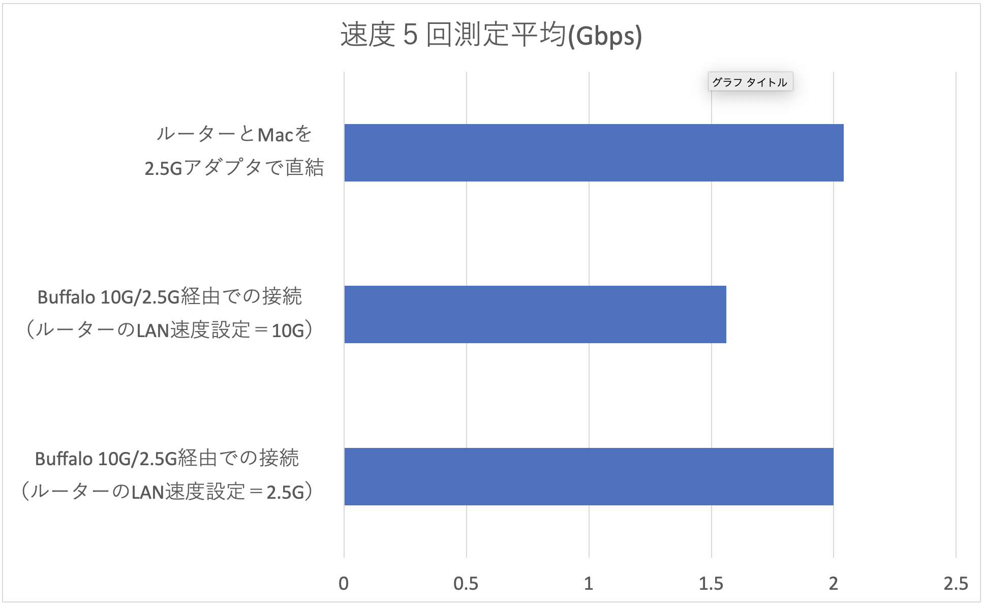 さて早速使ってみましたが、いろいろ試したところ、ちょっとクセを発見したので書いておきます。もしかすると10G/2.5G共用Hubというのはみんなそうなのかも知れませんが、このHubで10G→2.5G変換をやらせると、2割くらい速度が落ちます。上のグラフを見てください。ルーターとMacを直接2.5Gのアダプタで接続した場合は2Gbpsちょっとの速度が出る状況下で、BuffaloのHub経由だと2割強ほど速度が落ちることが分かります。ただこれには回避法があって、ルーター側のLANポート設定で、速度を2.5Gに固定してやるとBuffaloのHub経由でも速度が落ちないんですね。ですので、接続先の機器の速度が最大でも2.5Gとなる環境では、大元のルータのところから2.5Gに固定した方が良いと思います。これでまたMac側が10G対応だったりすれば、ルータも10G設定にして良いのだろうと思います。