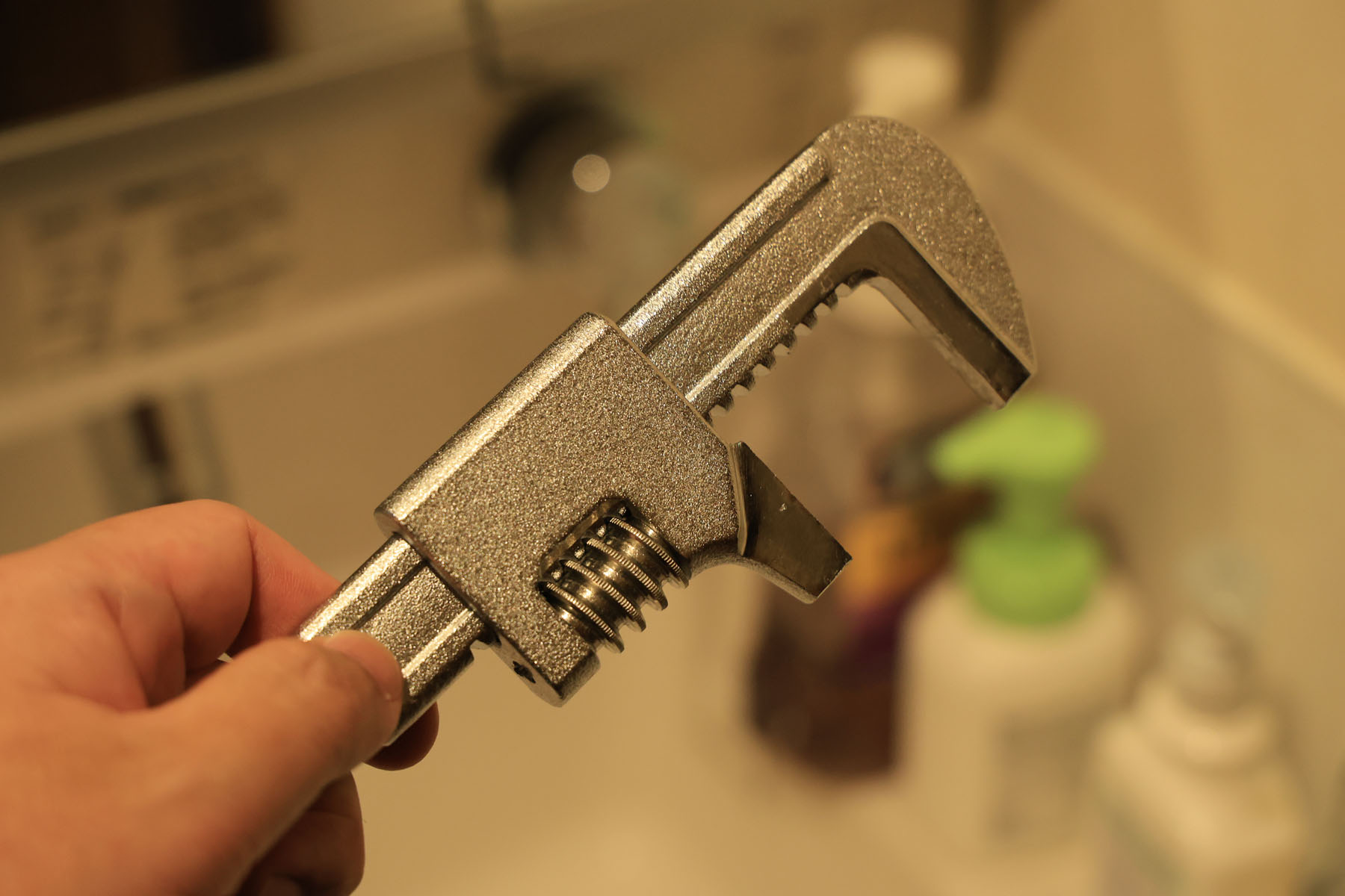 蛇口レバーの裏側にある隠し蓋を外し、六角レンチでねじを回しレバーを外します。次にモーターレンチ(写真)を使って、カートリッジカバーを外します。固着しているので、ハンマーでモーターレンチを叩いて回します。強い力を加えるよりは、細かい振動を何百回と加える感じの方が外しやすいようです。作業工程写真は割愛。