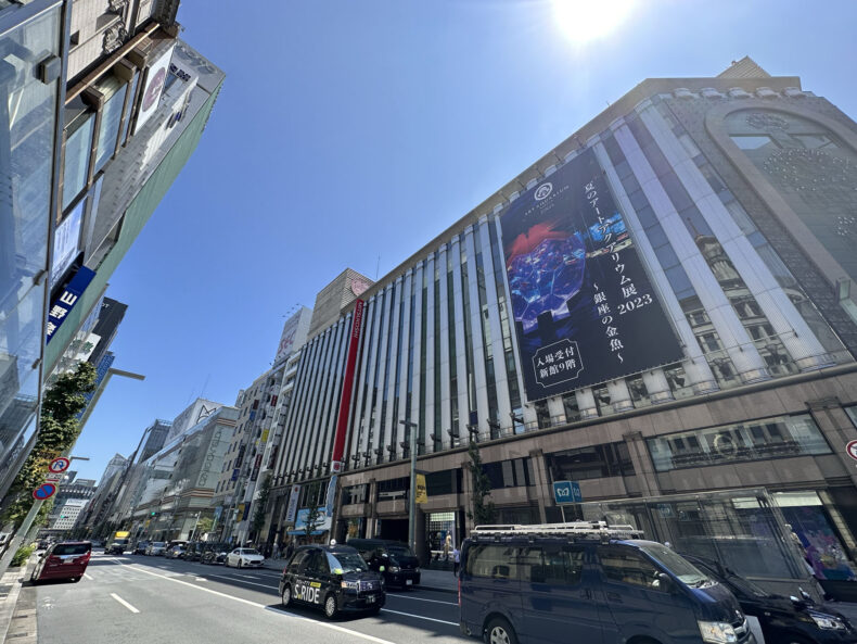 地下鉄直結ではありますが、隣の銀座三越に南雲さん(南雲暁彦さん)撮影の「アクアリウム」の告知写真が外壁に飾られているというので一枚記念に撮っておきました。南雲さん曰く、今までで一番大きく伸ばした展示とのこと。