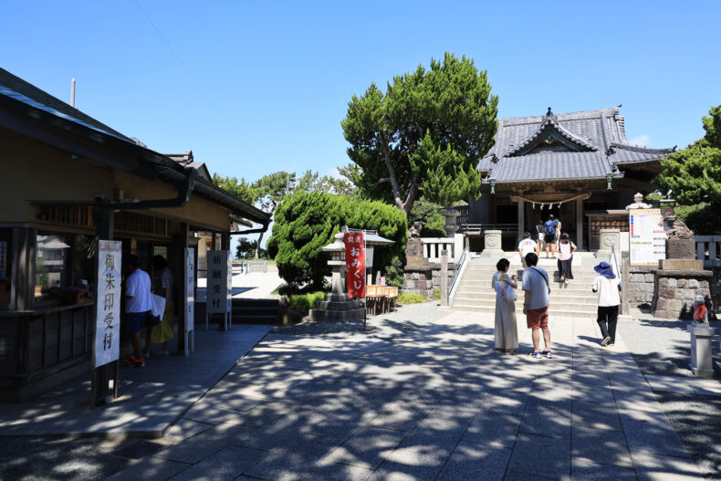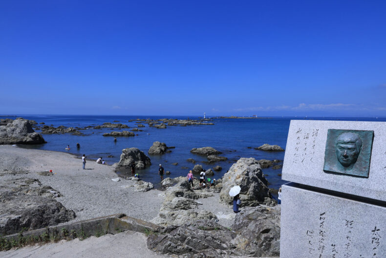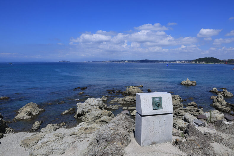 岬にある神社で葉山海水浴場に隣接。境内からすぐ海ですが、石原裕次郎の三回忌に合わせて建立された「石原裕次郎記念碑」越しに江ノ島と富士山(この日は見えませんでしたが)を望むことができます。この祈念碑のあたりは微妙に神社の敷地から外れてるということですかね…? なお祈念碑には裕次郎直筆の詩が刻まれています。