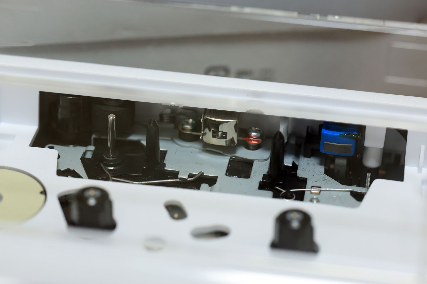 ヘッド構成。普通の2ヘッドです。若干頼りない感じに保持されているヘッドに、アジマス調整ネジが付いていますが、ネジロックされており触る気はしません。最近のヘッドって「アジマスフリーヘッド」になって、多少アジマスが変化していても音の変化が少ないんですよね確か。それともそれは再生専用ヘッドの話で、録再ヘッドは多少シビアなのかなぁ?