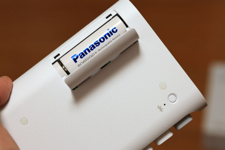 電源は前出のUSB-C外部給電か、単3電池2本です。Bluetoothもついていて、ペアリングボタンが見えます。電圧にシビアなのはBluetoothの方で、電池がなくなってくるとメカが止まる前にBluetoothが止まるようです。