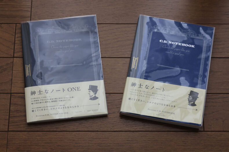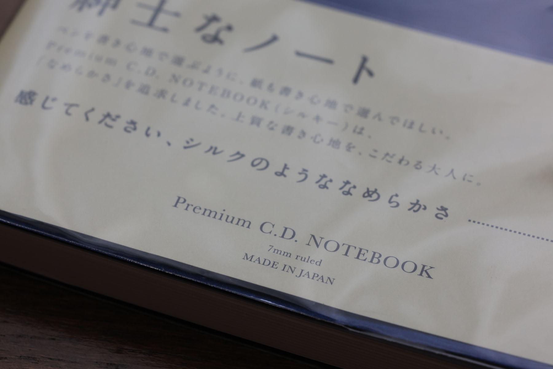 で、上の写真の右は何かというと、通常の3倍(96枚)の紳士なノート。厚みが。いや、どうやら商品的にはこちらが先に出ていて、左の薄い方(32枚)があとから出たようです。それで右のノートなんですが、娘のです。私が買うより少し先に、娘が駅前の文房具店で買っていたようです。こちら1,265円と、もはやノートというよりは手帳のお値段です。表紙の「CD NOTEBOOK」という文字は、厚い方だけ銀箔です。表紙の青さも厚い方が少し明るいです。