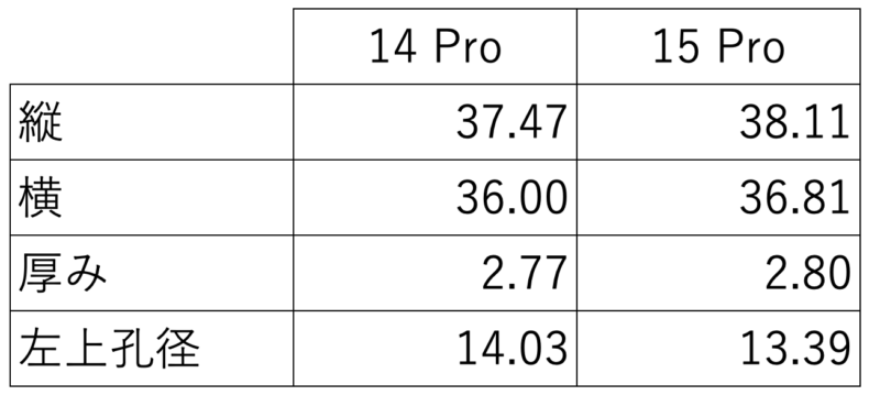 正確なところはAppleの一般公開向け図面(アクセサリのデザインガイドライン)がiPhone 14の世代までしか出ていないので実測ベースになってしまうのですが、 測ってみたところ以下のような寸法でした。