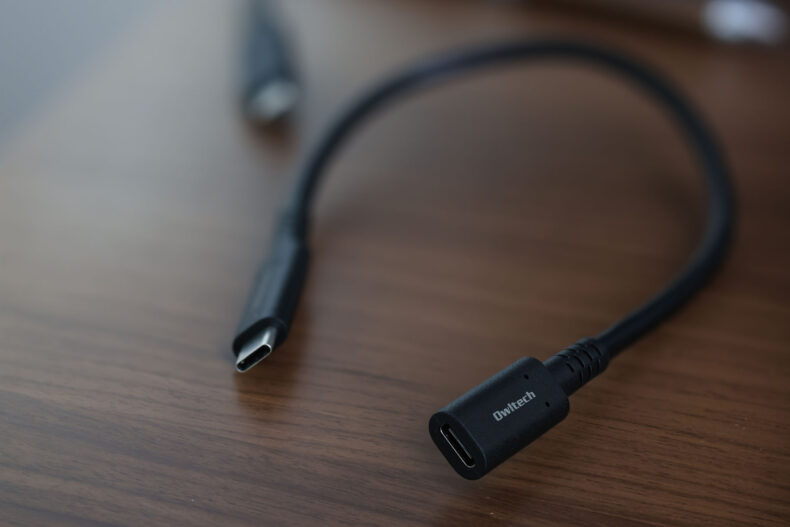 既存のUSB-Cケーブル(特に10Gbps以上の高速通信するもの)にこの延長ケーブルを接続すると微妙に長さが規格外になることがありますが、何とか実力の範囲内で、今のところ液晶モニター接続など、不具合は出ていません。ちょっと硬いケーブルですが、20Gbps/240W電送に対応するストロングなケーブルなので硬いのは仕方ないでしょう。