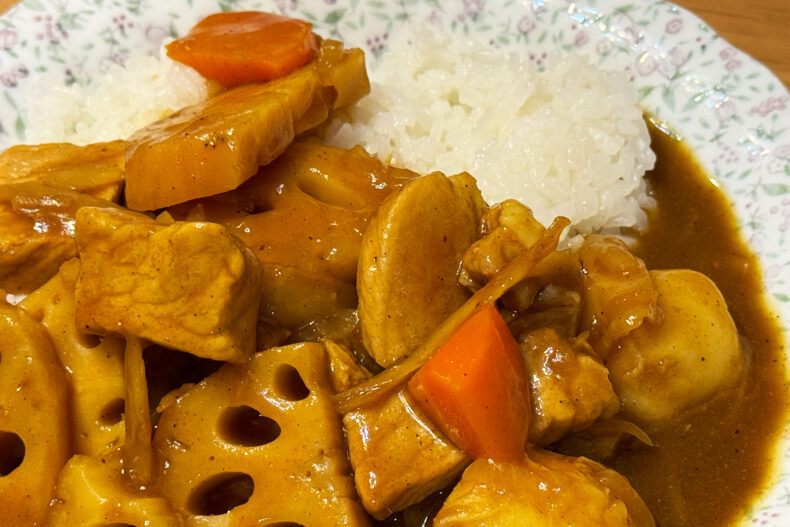レンコン、里芋、ゴボウ、にんじん、玉ねぎ、豚肉(カレー用が売っていなかったのでトンカツ用ロース肉を切って使用)で根菜カレーを作ってみたところ、なんともまぁ、薬膳カレーのような味わいになりました。スパイシーな香りが広がりますが、食べてみても辛くない、という不思議なカレーです。これは面白いですね。辛いのが苦手な息子や妻にも評判が良かったです。娘はもう少し辛くてもいいと言っていました。それは買い置きの「GABAN FOR CURRY スパイスカレートッピング」で調節してください。