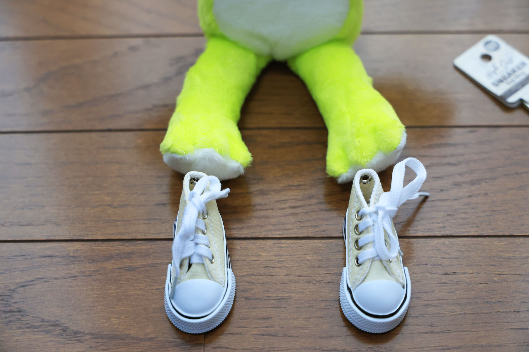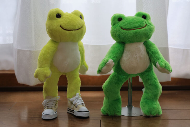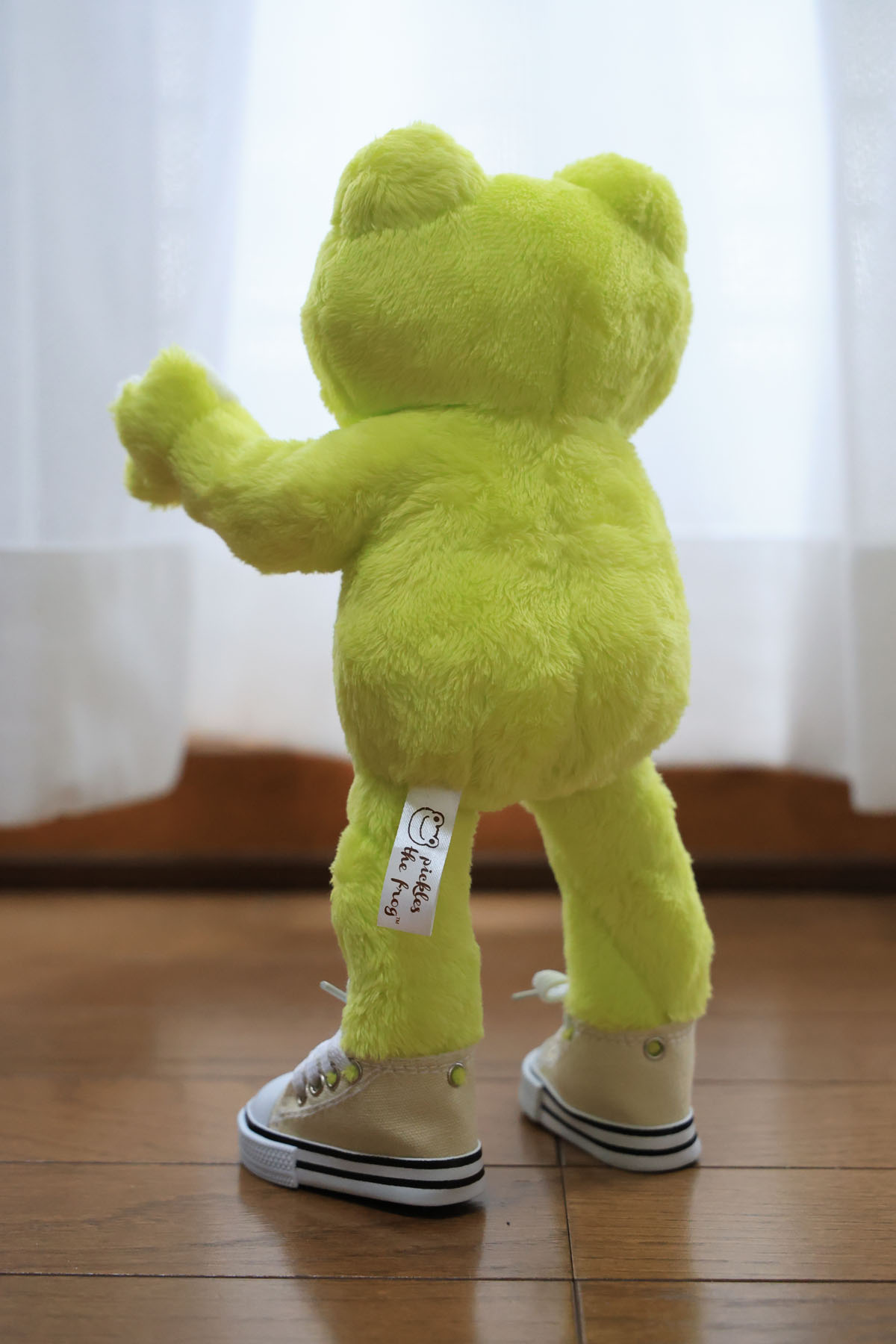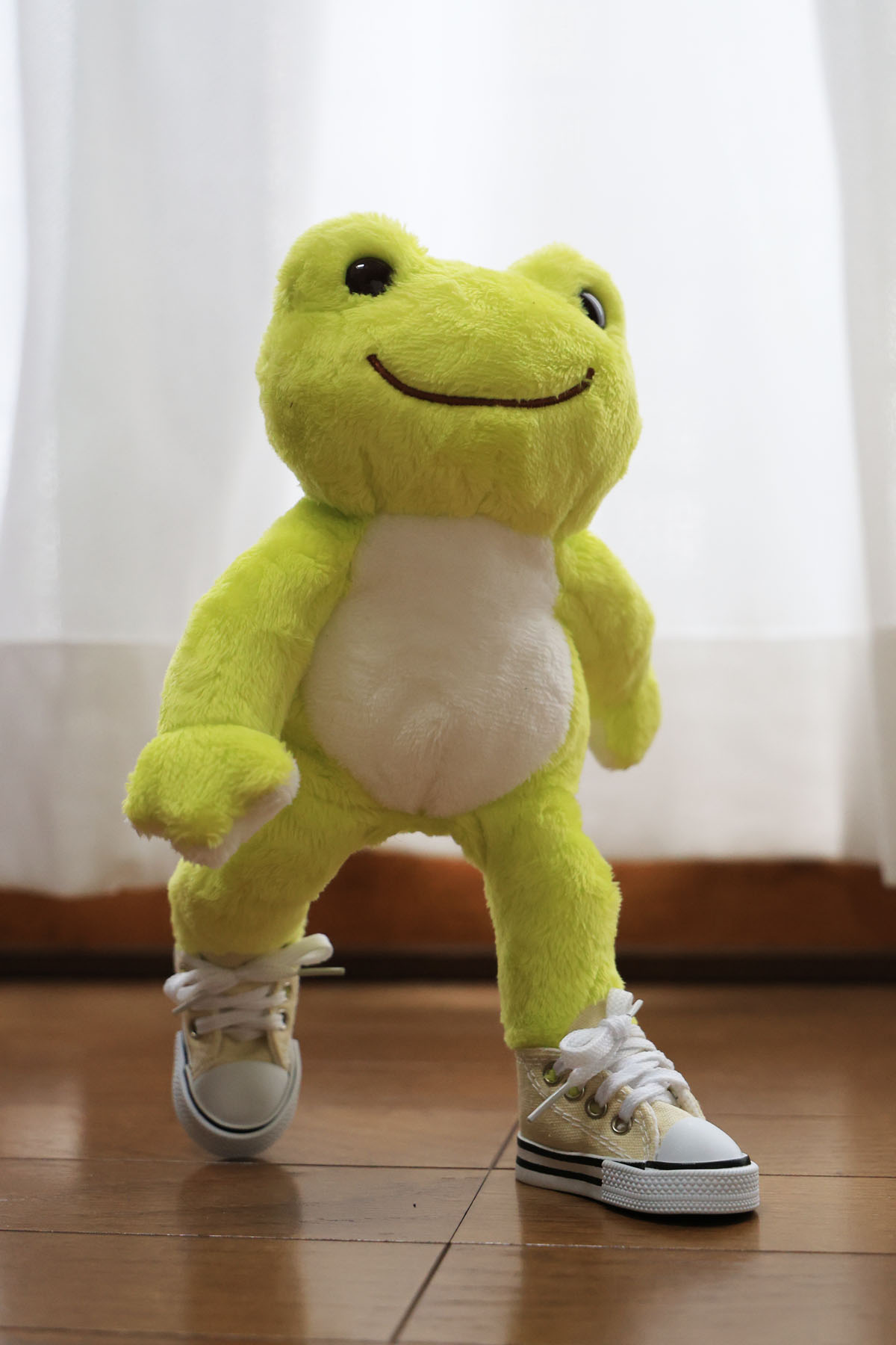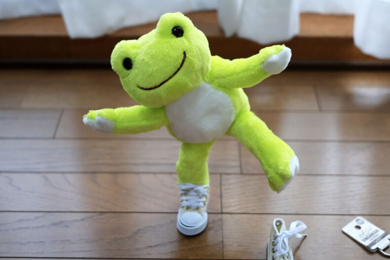 かえるのピクルスのビーンドール(ぬいぐるみ)の標準サイズ(高さ25cmくらいのもの)には針金入りの「ポージング」タイプと、特に何も入っていないものの二種類があるのですが、「ポージング」タイプは別売のシューズを履かせると自立させられることを知りました。時々立ってるピクルスを見かけるのはそういうことだったかー!