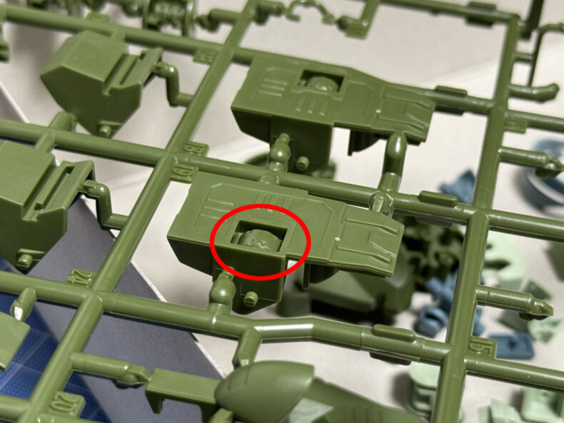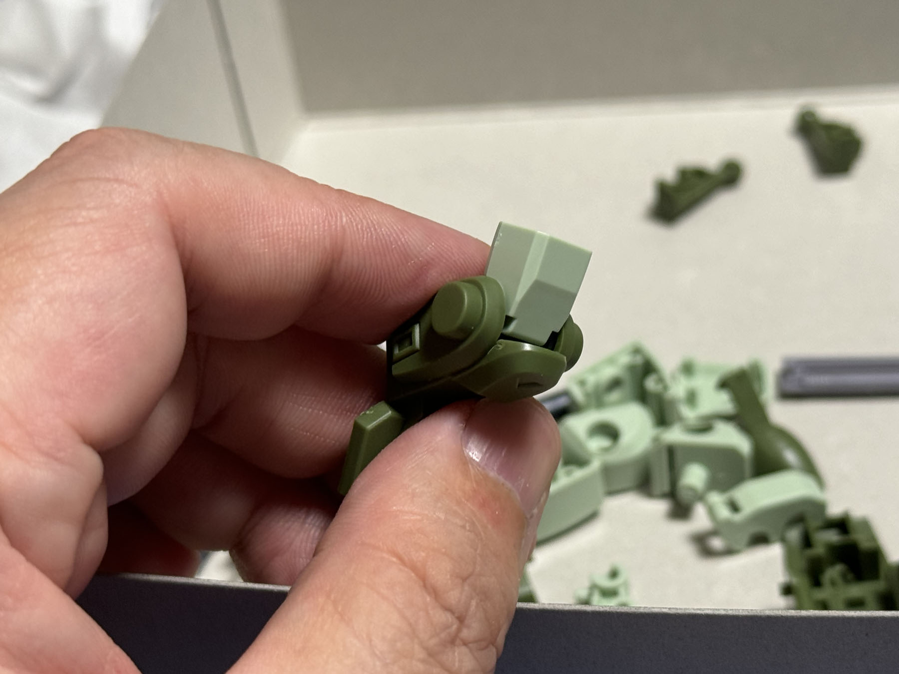 この薄緑色の部分は上腕なのですが、普通、この部分は部品の真ん中に繋ぎ目が来てしまうのが通例でしたが、このキットは角のところに繋ぎ目が来るようになっており、繋ぎ目がほぼ見えません。素晴らしいです。もう全部こうしてください。