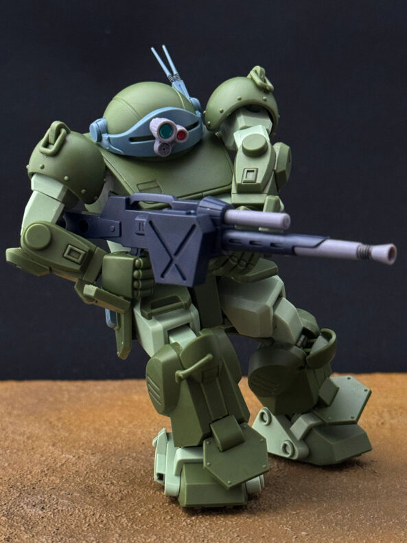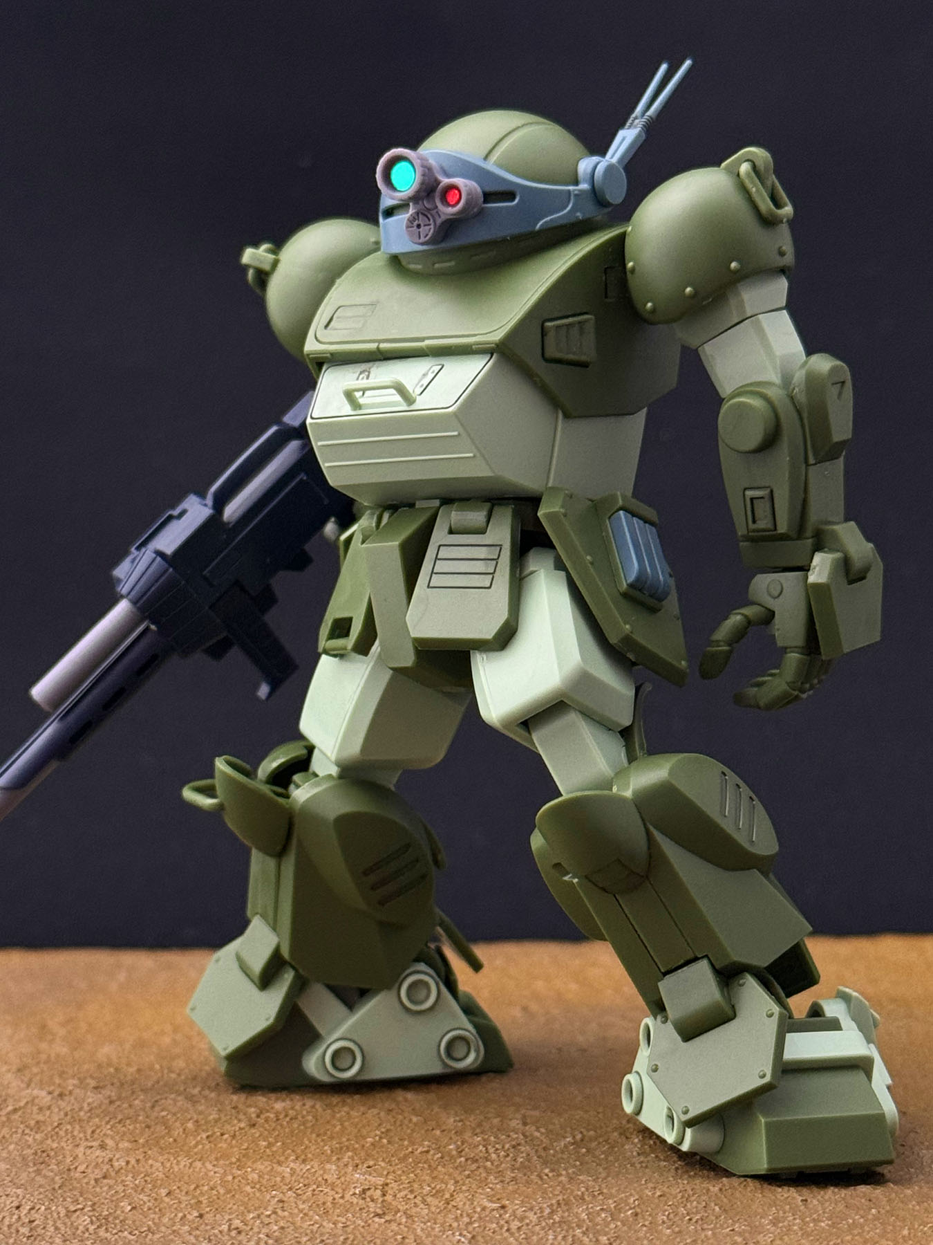 完成。スコープドッグの立体ものを初めて組んだ気がします。高さ12cmほどのモデルですが、いい感じの存在感です。過去いくつか発売されたスコープドッグのプラモデルと比較するとずんぐりむっくり系で、劇中のイメージには近いと思います。素組み、トップコートなし、部分スミ入れのみです。