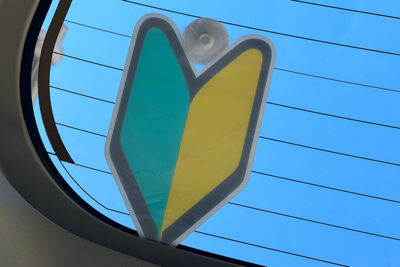 そこで困ったのが娘が乗るパッソ(さすがにアウディは貸しません)のリアゲート。多くのダイハツの軽がそうであるように、軽の技術を用いて作られた普通車パッソ/ブーンもまたリアゲートが樹脂製です。従って教習所を卒業するときに貰ったマグネット貼り付け式の初心者マークが付きません。すぐさまダイソーに行って上の写真のような吸盤付きの初心者マークを買ってリアガラスの内側から付けてみたのですが、吸盤が熱線の凹凸にどうしても少し被ってしまうため、走行中に落下してしまいます。