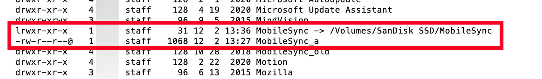 ちょっとめんどいのがiPhoneのバックアップ(MobileSync)で、/user/Application Support/Mobile Syncを、外付けドライブの任意の場所に移動したあと、ln -s コマンドで元の場所から移動先へのシンボリックリンクを作成します。最初、Finderのエイリアスでもいいんじゃね?とやってみたのですが、ダメでした。