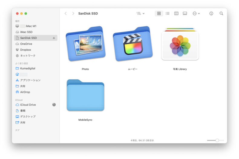 試しに、外付けのSanDisk SSD 1TBに Finderで管理している写真、動画、それから「写真」アプリのライブラリ(写真Library)、iPhoneのバックアップ(MobileSync)を移動しました。