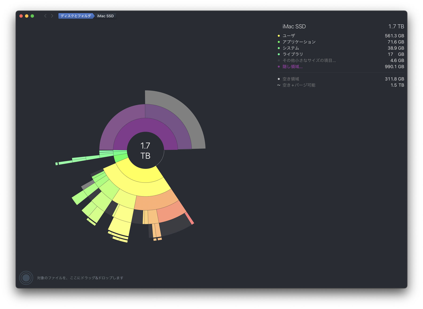 上のグラフの彩度が高いところが内蔵SSD、紫の部分が内蔵SSDですがシステムがTimeMachineなどに使っている部分です。(空き容量があるとシステムが勝手に使います)