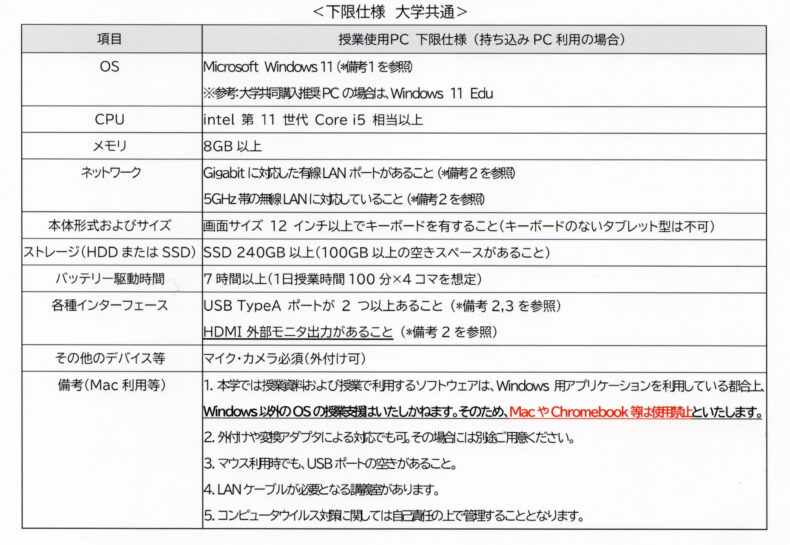 ほぼ選択の余地なく学校指定のLet’s noteとなった息子の大学用パソコンですが、では大学のサポートを受けられないことを承知で市販モデルから選んだらどうなるのでしょうか。まず大学が掲げている下限仕様はこうです: