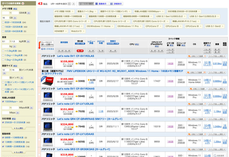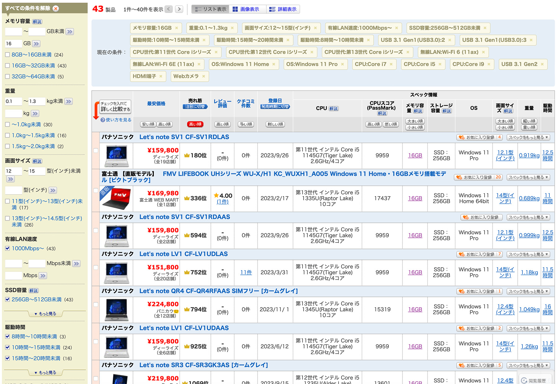 これを満たすモデルをカカクコムで検索してみます。重量は上の子がMacBook Pro(2013)の1.5kgがしんどいと言っていたので、一旦1.3kgで区切ってみました。あとRAMはLet’s noteと同じ16GBに。すると検索結果はこうなります: