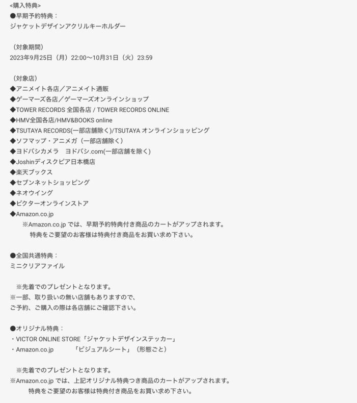 でもビクターのWebページは、「ミニクリアファイル」の代わりに「ビジュアルシート」が付く、という風には読めないんだよなぁ。さらにややこしいのは、VICTOR ONLINE STOREだと、「ミニクリアファイル」も「ジャケットデザインステッカー」も付くということ。すなわち「オリジナル特典」は「全国共通特典」と排他ではないのです。