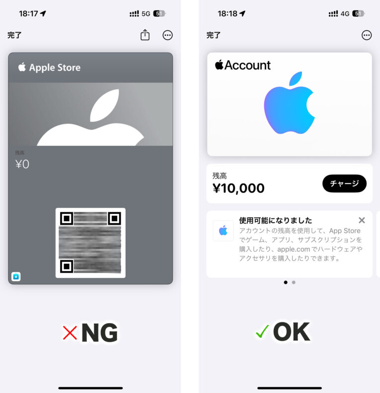 しかし、セブンイレブンのレジでAppleアカウントにチャージするってどうやるんだろう…と不思議で、1件目のセブンイレブンではiPhoneのウォレットに入っていた下の左の画面のバーコードを提示してみたのですが「やり方が分かりません」と店員がギブアップ。レジの液晶画面にこのキャンペーンの広告が出てるのにね。バイトだったんでしょう。