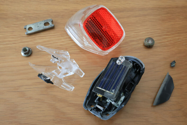 交換するべく分解を試みたところ…粉砕しました。15年間の日光でプラスチックが脆くなっていたようです。電池は盛大に液漏れもあり、ソーラーパネルもなんか半分くらい謎のダメージを受けている様子。電池は500円ほどですが、これはこのモジュール丸ごと交換した方がいいなと、Amazonを物色。