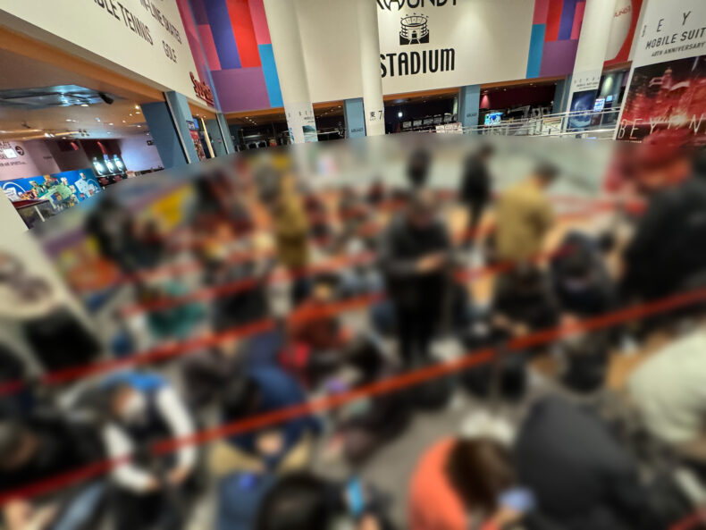 6:00 並び始め。だいたい70番目。なおXによると、先頭付近の人は前泊だった様子。ラウンドワンがあり24時間空いているフロアなので、泊まろうと思えば泊まれる、
