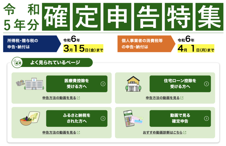 以下は確定申告のトップページなのですが、ここにある「医療費控除を受ける方へ」のボタンを押しても、申請書作成のページに飛べないんですよ…(説明のページに飛ぶだけ)。