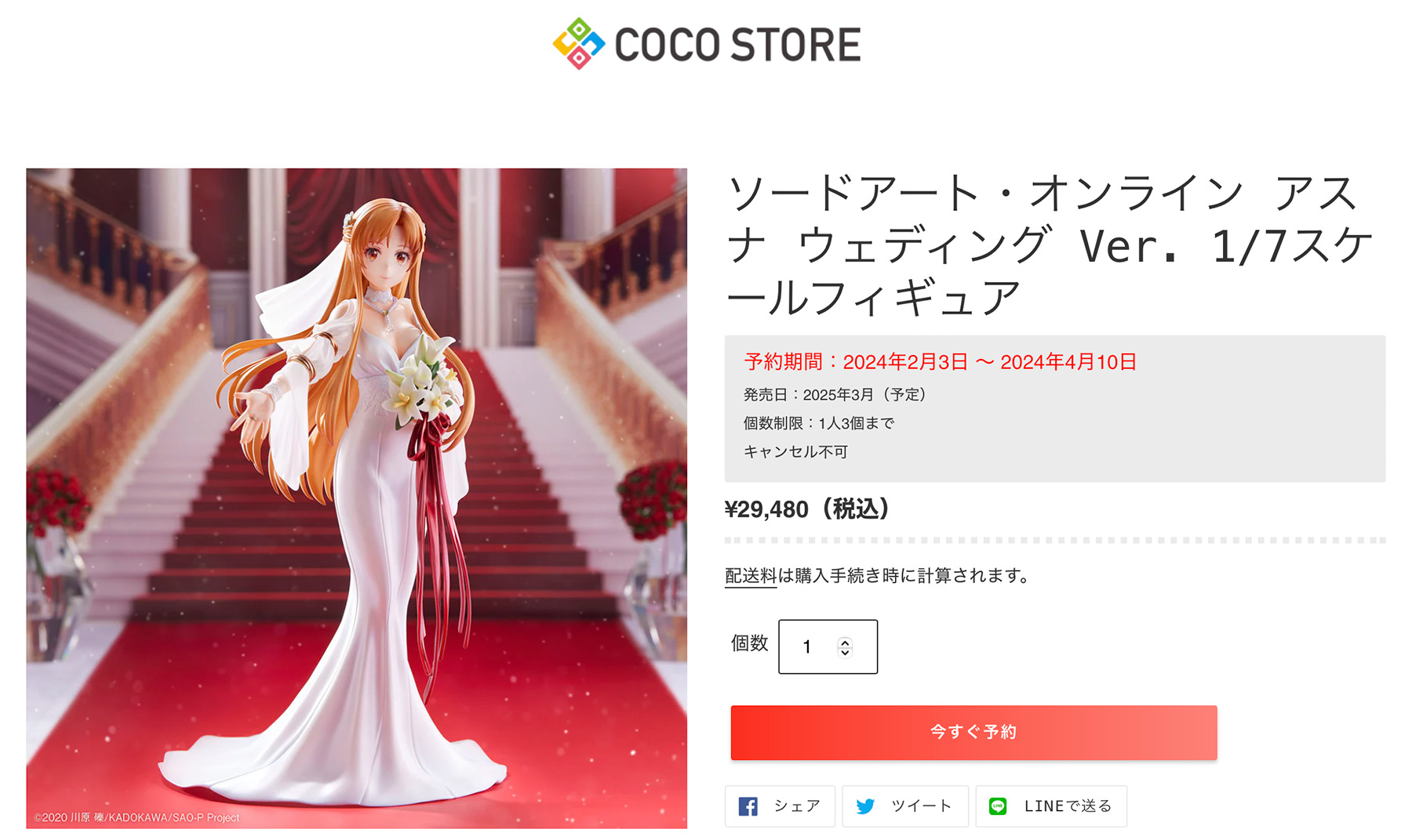 1年前に渋谷パルコで本物のウエディングドレスを着ていたソードアートオンラインのアスナのフィギュアが完成したんだそうで。