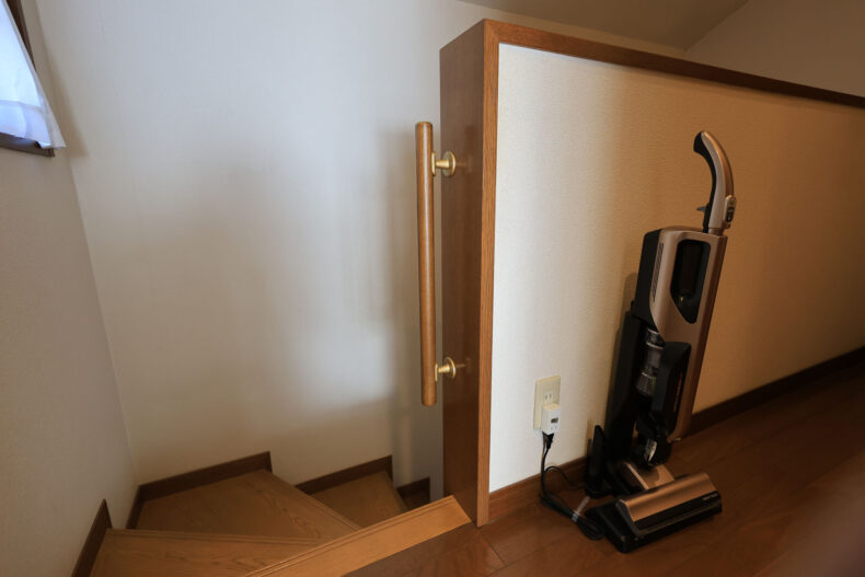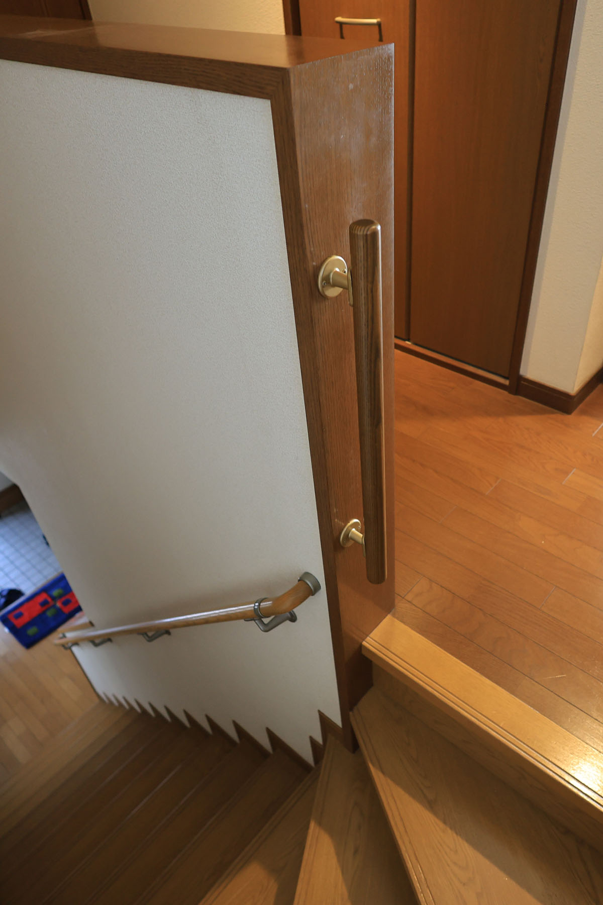 下の階段の手すりとは色も柄も違うのですが、まぁ統一感よりも設置場所に馴染んだ方がいいだろうと考え濃い色の手すりを選択。娘もこの増設した手すりは「助かる」とのことで、よく見ると手すりを付けたところの木材が白化しています。これ、娘がファンデーションの付いた手で階段降りるときに掴みまくってたんですね、きっと。アウディも娘が乗るとドアノブ周り白くなるし、絶対犯人は娘。今後は手すりを掴んでくれるでしょう。