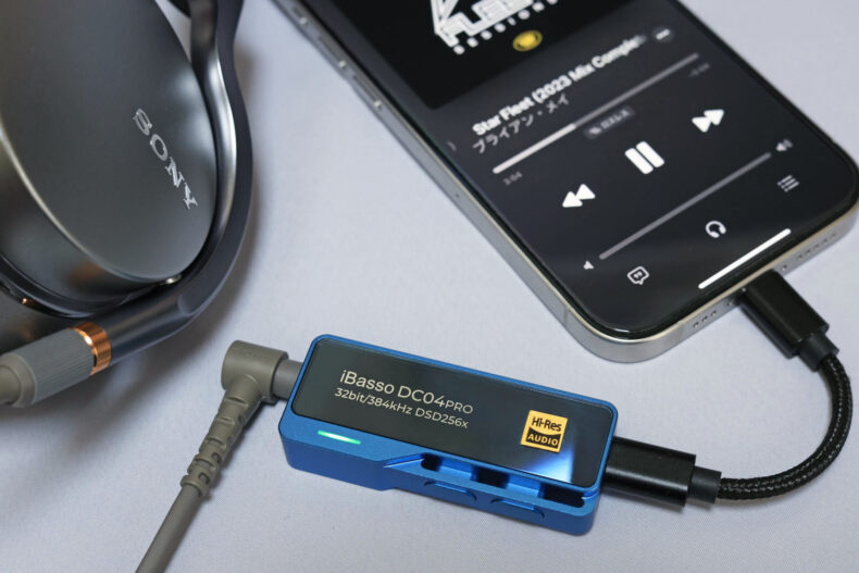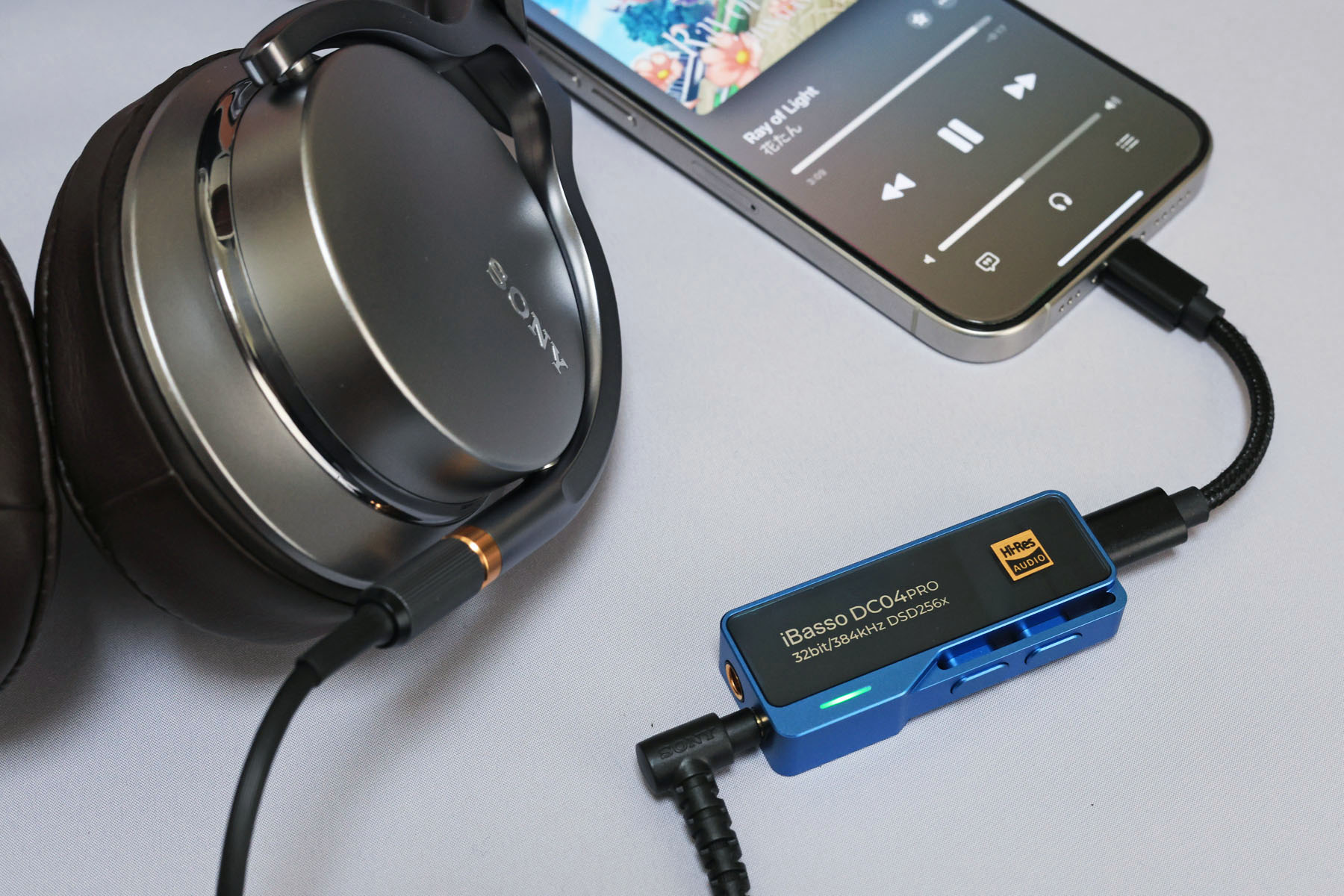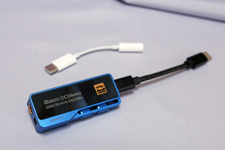 そしてこっちがこのエントリの主役。iBasso DC04PROです。いわゆる「ドングル型DAC」に属する製品で、純正のヘッドホンアダプタより高音質を実現するものです。ヘッドホンアンプまではちょっと手が届かないので、実用的なところでバランス出力が体験できる製品ということで選びました。このDC04PROは3.5mmステレオ出力ジャックと4.4mmバランス出力ジャックがあり、聞き比べができます。(同時出力はできません。)