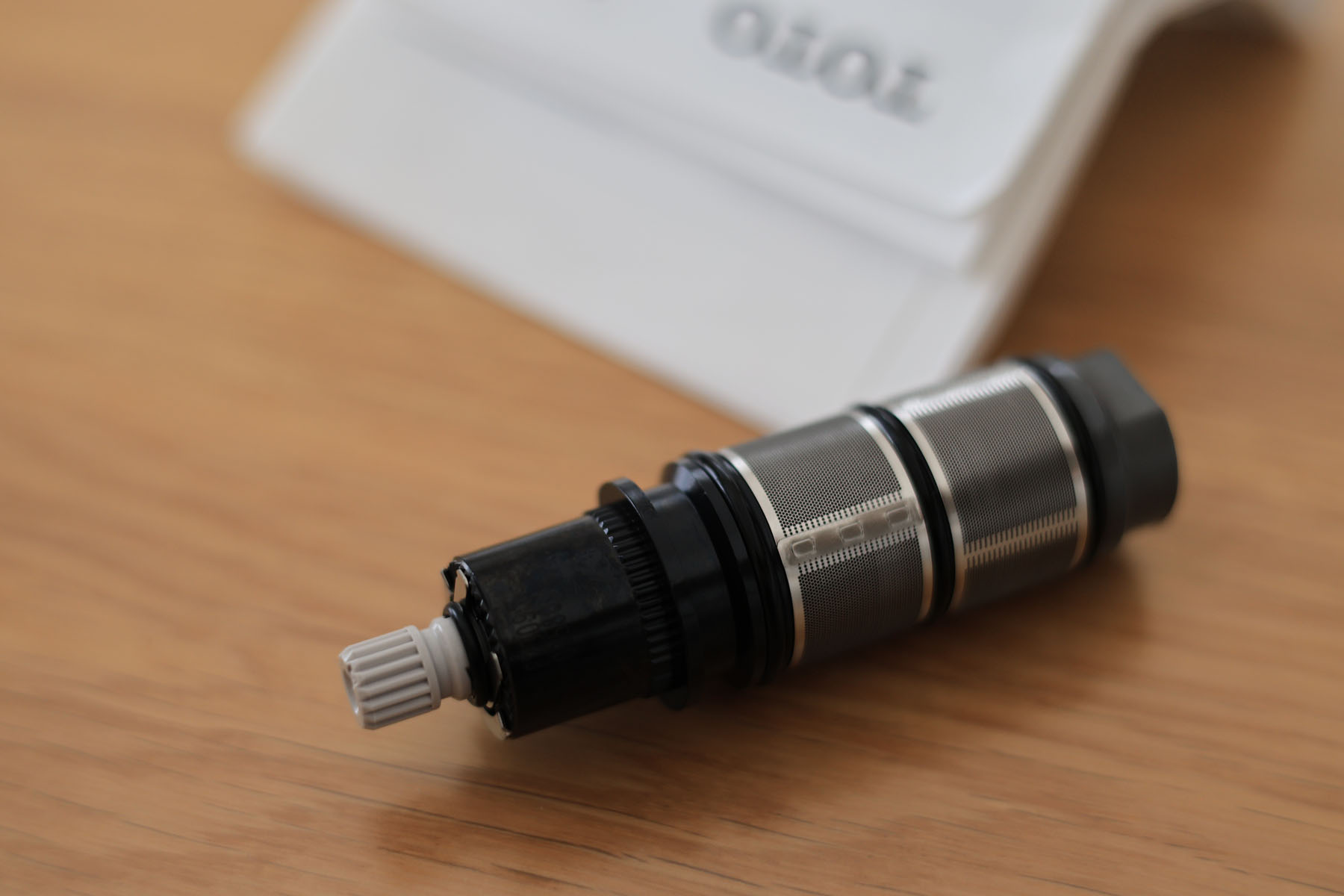 お風呂のシャワーの温度調節が難しくなりました。温度ダイヤルを回しても湯温が変化しなかったり、かと思えばドンという音がして急激に温度が変わったりします。おそらくサーモスタット水栓の中身(サーモユニット)が壊れたのだろうと思い、部品を取り寄せました。リフォームして10年ですから、そろそろ壊れることもありそうです。でも「こんなもんだろうなぁ」でそのまま使い続ける人も多そうです。