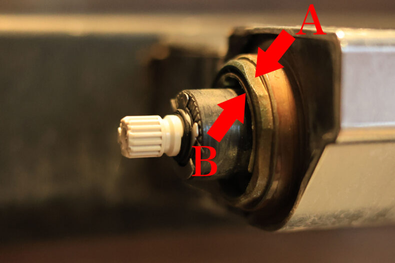 するとこうなります。ここでA/Bとも外すのですが、BはAで抑えられているだけですので、Aを外すと外せます。Aを水道用のレンチで回して外しますが、A自体は金属製なのですが受け側が樹脂のようで、それほど力を入れずに外せるはずです。もし力を加えても外れない場合は、レンチを噛ます位置を変えるとあっさり外れると思います。Aを外すと一緒にBもポロッと落ちますが、共になくさないようにしましょう。