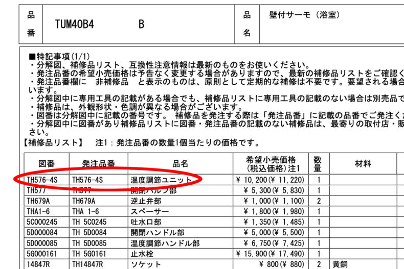 TUM20B4Bです。この型番で、TOTOのサイトを調べると、部品リストが出てきます。