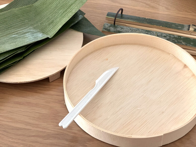 付属のプラスチックナイフを使って切り分けて食べます。