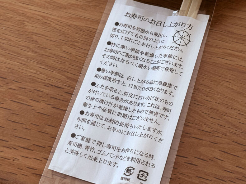 醤油が要らないくらい、しっかり味が付いています。酢飯、ますともに味が付いています。押し寿司なのでご飯がぽろぽろと言うことはなく、プラスチックナイフで思った通りに切れます。一説にはこうやって笹を開かずに笹ごと切るなんて食べ方もあるようですが、どうなんでしょう。
