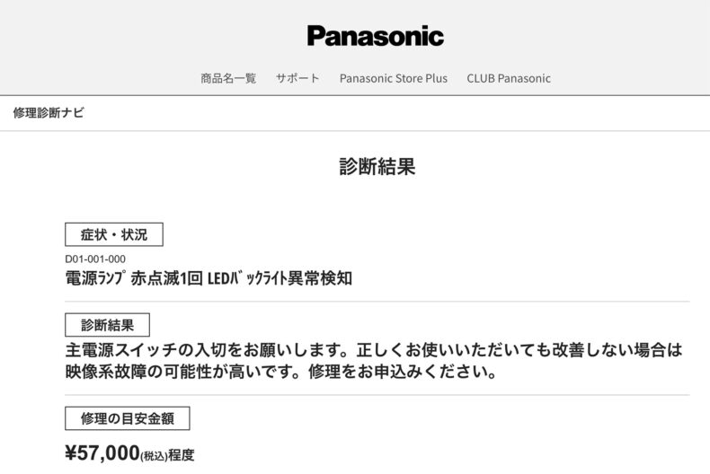 2015年3月に購入した実家用のTH-42C300が壊れました。8年11ヶ月。ちょっと早いような気もしますが、廉価版の300シリーズならそんなものかも知れません。うちのTH-32A320も300シリーズの仲間ですが、7年目にしてバックライトが部分的に壊れています。(壊れたまま使っています。その後、輝点は増えて5箇所になりましたが。)