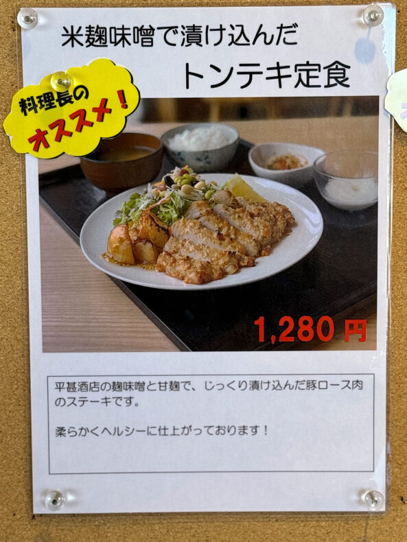 メニューは発酵に絡めた麹系のものが多く、どれも美味しそう。私はメニューの筆頭にあった「トンテキ定食」(料理長のオススメ)を注文しました。