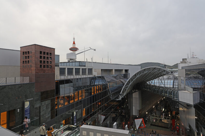 奥に見える京都タワーとの高さ比較。これくらい高いです。あの京都タワーが飛んできてここに落下するという発想になるのも分かる気がします。