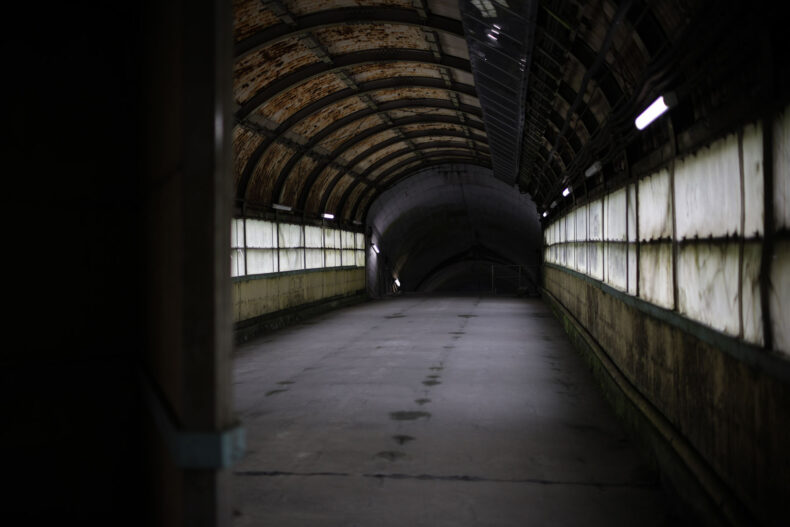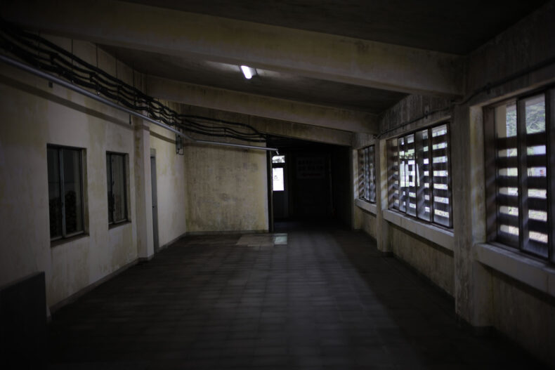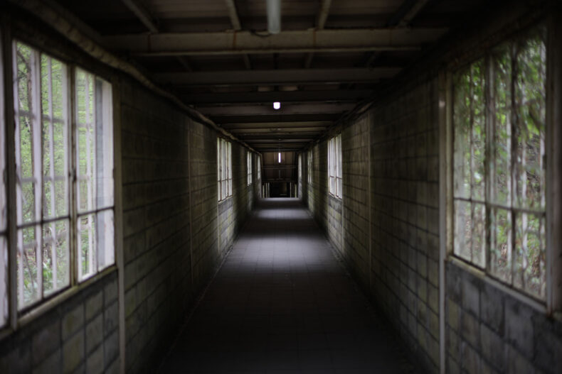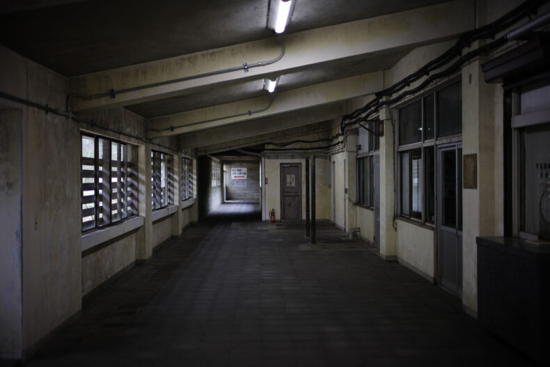 さらに通路です。いやもう完全に怖いです。ちなみにここを外から撮るとこうなります。↓