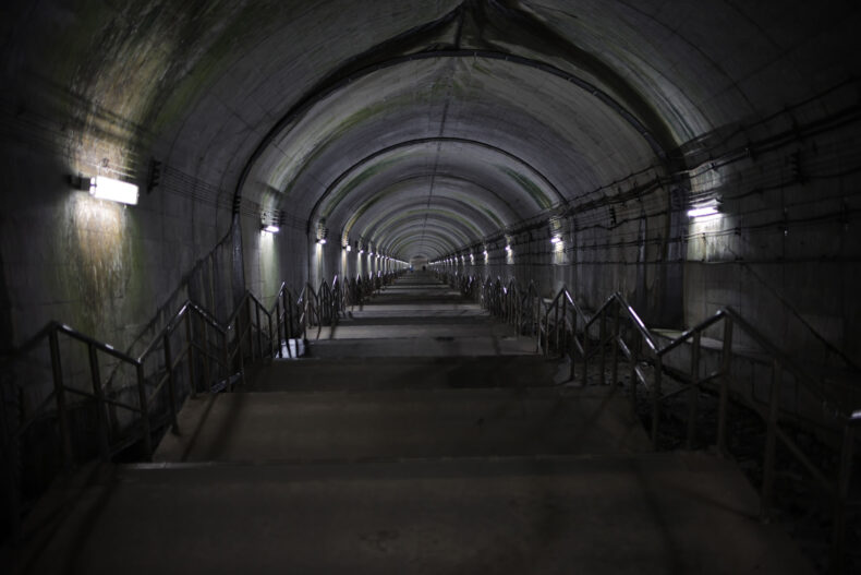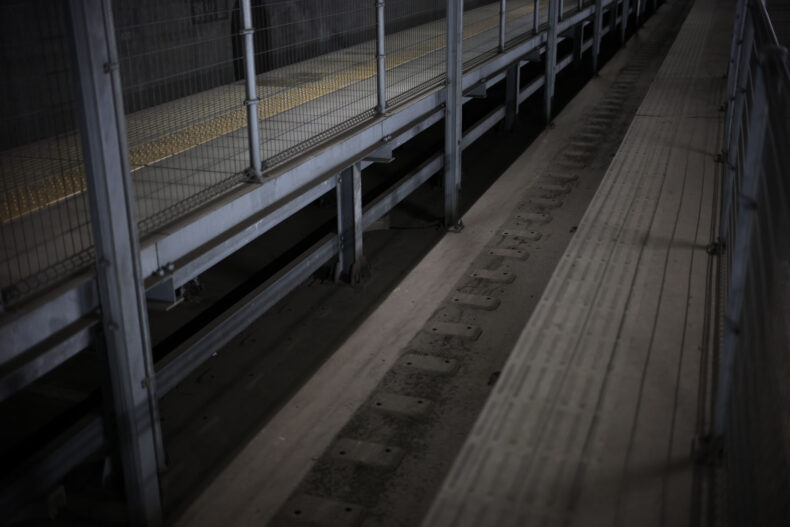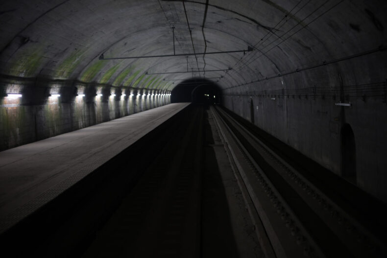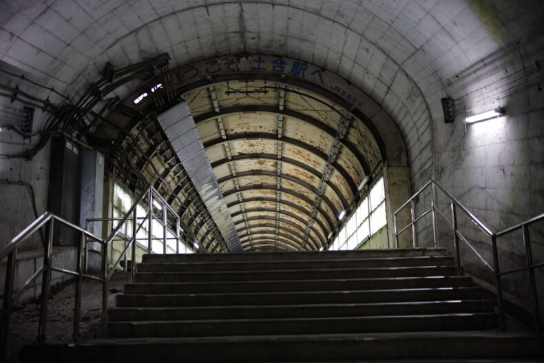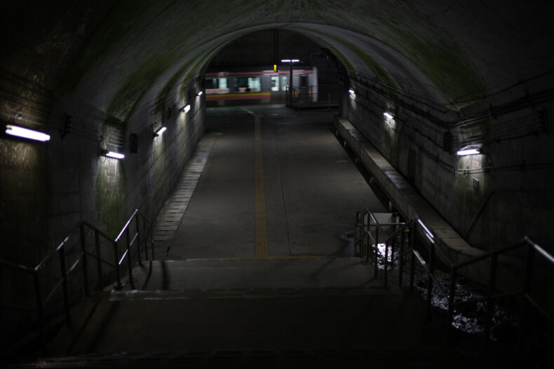 そして問題の下り側ホームへ。この奥の暗いところが下り線ホームに向かう通路です。