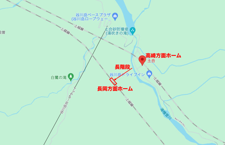 上り線(高崎方面)は地上なのですが、下り線(長岡方面)は地下(それでも標高は300m以上)にあり、下の地図で上越線が2本走っていてこんなに離れている意味が分からなかったのですが、この2線間の距離を歩いて移動するということを現地で初めて理解しました。そしてその距離の半分以上は名物の長い階段になります。