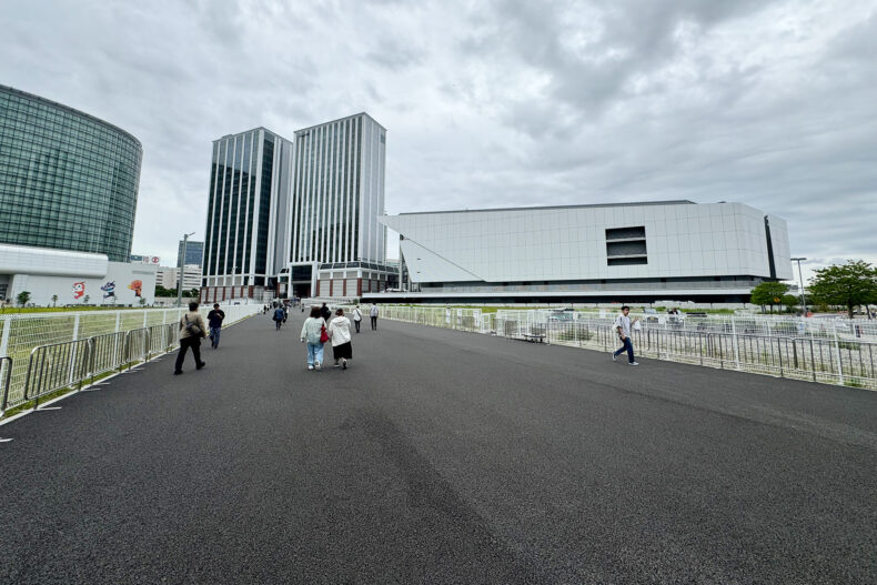 右手の白い箱がKアリーナ本体です。この広い歩道が、下の図で言う赤い矢印です。