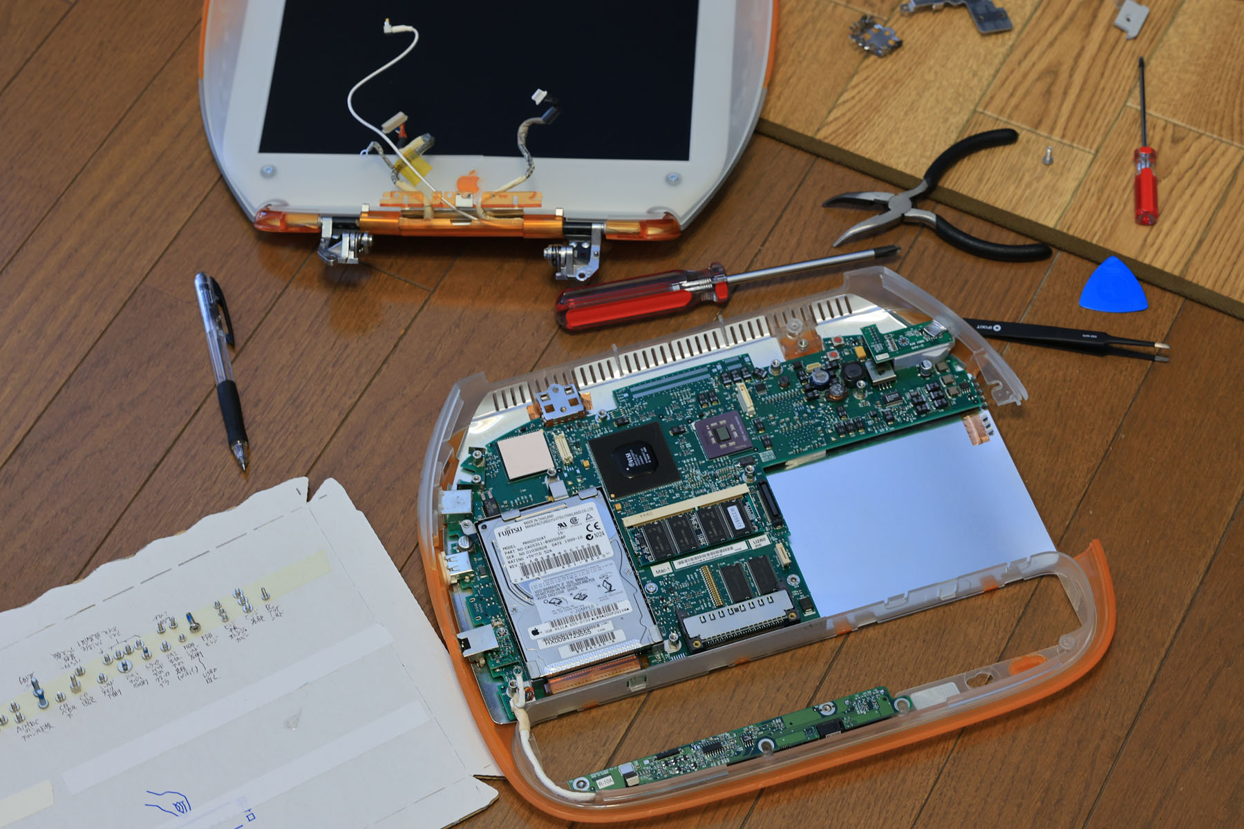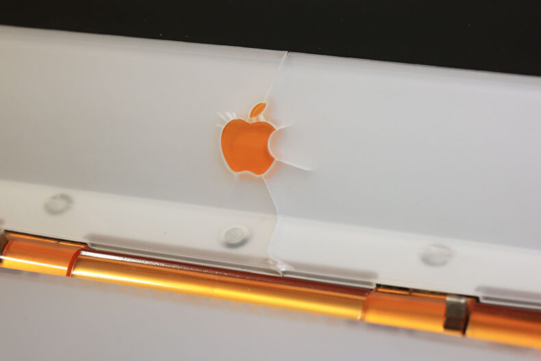 ビデガーシンドロームを起こしたiBook(クラムシェル)は液晶下のリンゴマークの周囲にもヒビが入っていて、液体接着剤を流し込めばワンチャン傷が目立たなくなるるかな?と思いベゼルの分解を試みたところ…