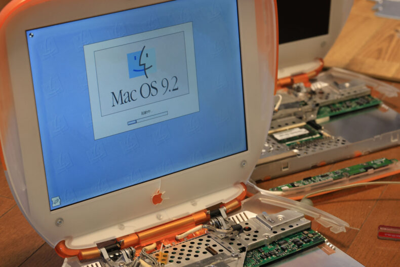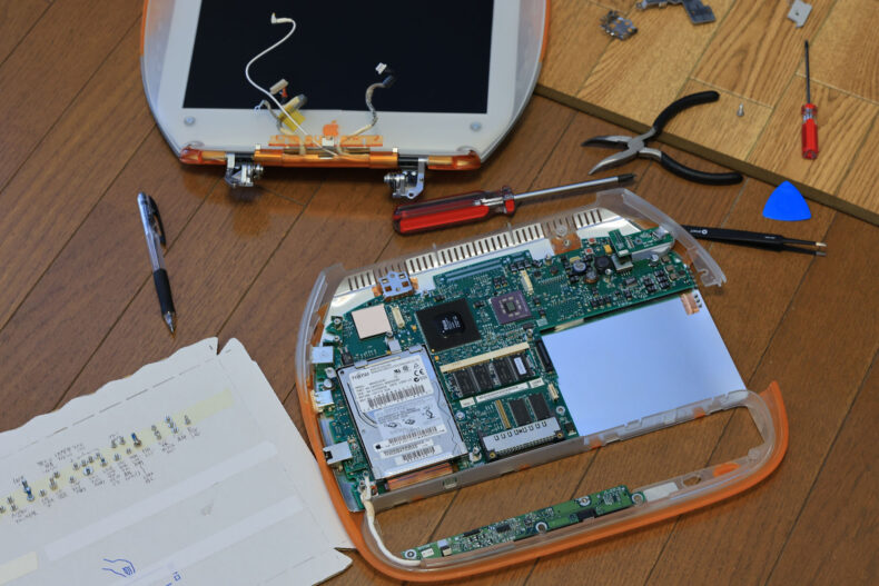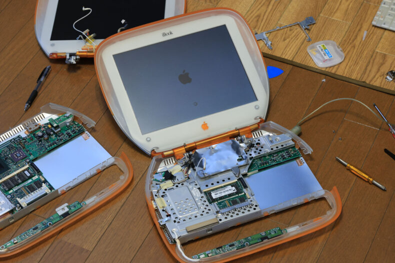 一応、この世代にしては綺麗なiBookが出来上がりはしましたが、中はかなり満身創痍で、ポリカーボネートのネジ受けがバカになっている箇所が多数あります。もう当分このタイプのiBookの分解組立はやりたくないですね。分解組立に伴う新たなダメージも生じるので、正直コスパは宜しくありません。