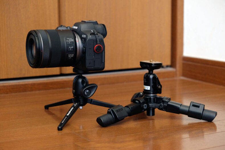 うちにある低い三脚。マンフロットのテーブルトップ三脚と、SLIKのミニプロ7+ベルボンQHD-33雲台。これでも撮影対象には高すぎます。