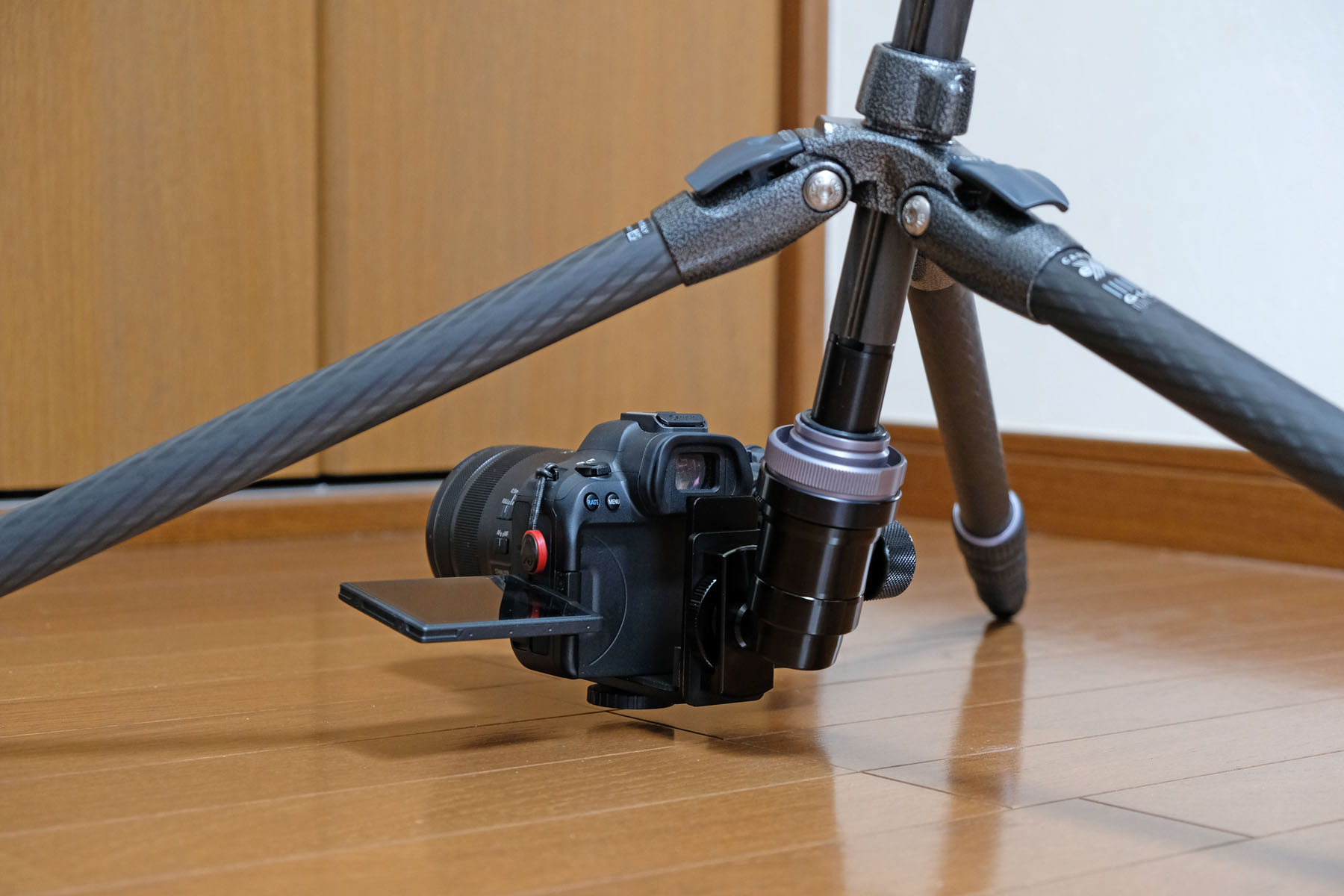 これこれ、これですよ、求めていた低さは。三脚のセンターポールを上下逆に取り付けて使います。雲台→L型プレート→カメラという接続になります。
