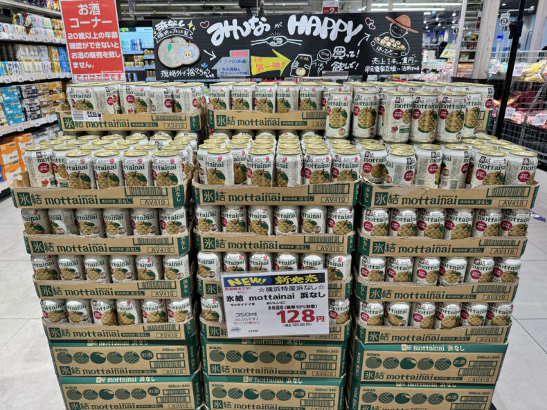 友人が「氷結 mottainai 浜なし」が美味しい…というので探してみたんですが、売ってないなぁ…と思ったら特設コーナーがありました。近所のスーパーに。
