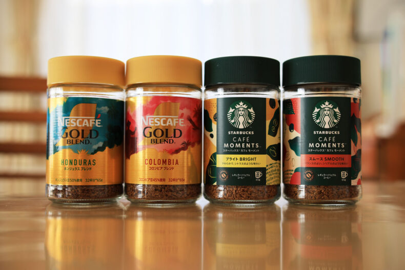 香味焙煎がモデルチェンジになって、瓶入りでなくなった上に味も変になっちゃってとても悲しいのですが、「ゴールドブレンド・ホンジュラス」と「ゴールドブレンド・コロンビア」が後継品相当という話を聞き、買ってみました。ついでに類似品っぽい感じがしたスタバの「カフェモーメンツ・ブライト」と「カフェモーメンツ・スムース」も買ってみました。スタバの冠は付いていますが、作っているのはネスレです。