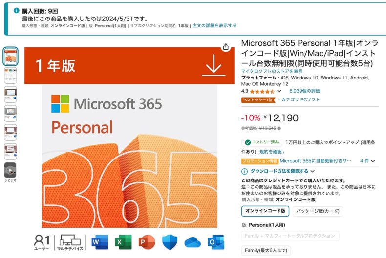 Microsoft365(Office 365)が安いというので、買いました。調べたら昨年も同じ日に買っているようです。この日はOfficeが安いんですかね。
