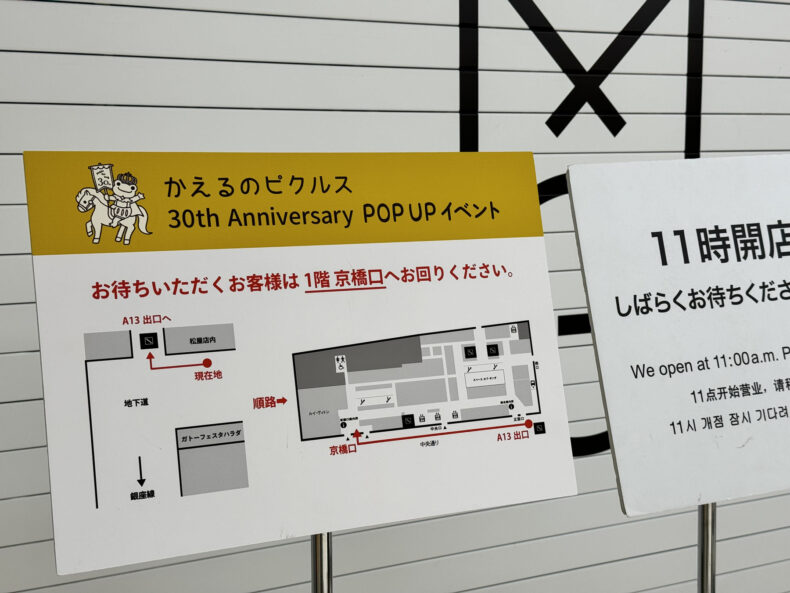 欲しいものがあったので、銀座松屋で開催中の「かえるのピクルス 30th Anniversary POP UPイベント」に行ってきました。どこに並べばいいんだろう…と地下をうろついてたら看板発見。