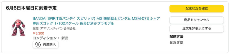 今日のお昼過ぎくらいに「AmazonでMGシャア専用ズゴック販売中」というツイートを見かけて、「んなわけあるか」(転売価格のならあるだろうけど)と見に行ったら本当にAmazon.co.jpの出品で定価3,300円であって、「まじか」と思い、元々そんなに(並んだりクリック競争したりしてまで)買う気はなかったんですが「定価で買えるなら…」と、「カートに入れる」を押したところエラー。