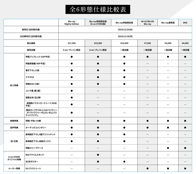 注目株としては [Joshin限定版]キャラクターデザイン平井久司描きおろしイラスト(イザーク&ディアッカ)使用A4サイズキャラファイングラフ(シリアルナンバー入り)つきBlu-ray特装限定版[26,400円(税込)] なんかシリアルナンバー付きでプレミアム感高いですが、イザーク&ディアッカというのが客を選びそうです。売れ筋は[A-on STORE限定版]キャラクターデザイン平井久司描きおろしイラスト(キラ&アスラン)使用BIGアクリルスタンド(A4サイズ以内)つき Blu-ray特装限定版 [19,800円(税込)]あたりでしょうか。