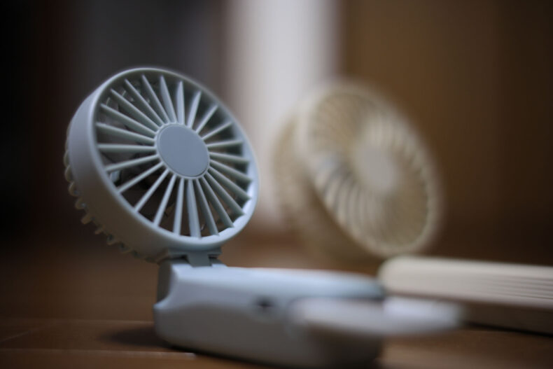 実は時を同じくして娘も古いのが7年使ってバッテリーがへたったとのことでロフトで買ってきました。奥のベージュのものです。メーカー不詳。(追記:MOTTERUハンディファン アーモンドミルク だそうです。)